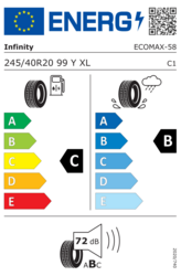 Oblikovan s strani znamke Infinity, pnevmatika Ecomax 245/40 R20 99Y XL zagotavlja optimalno varnost, zlasti zaradi boljšega nadzora nad akvaplaningom in krajše zavorne razdalje na vseh vrstah tal.